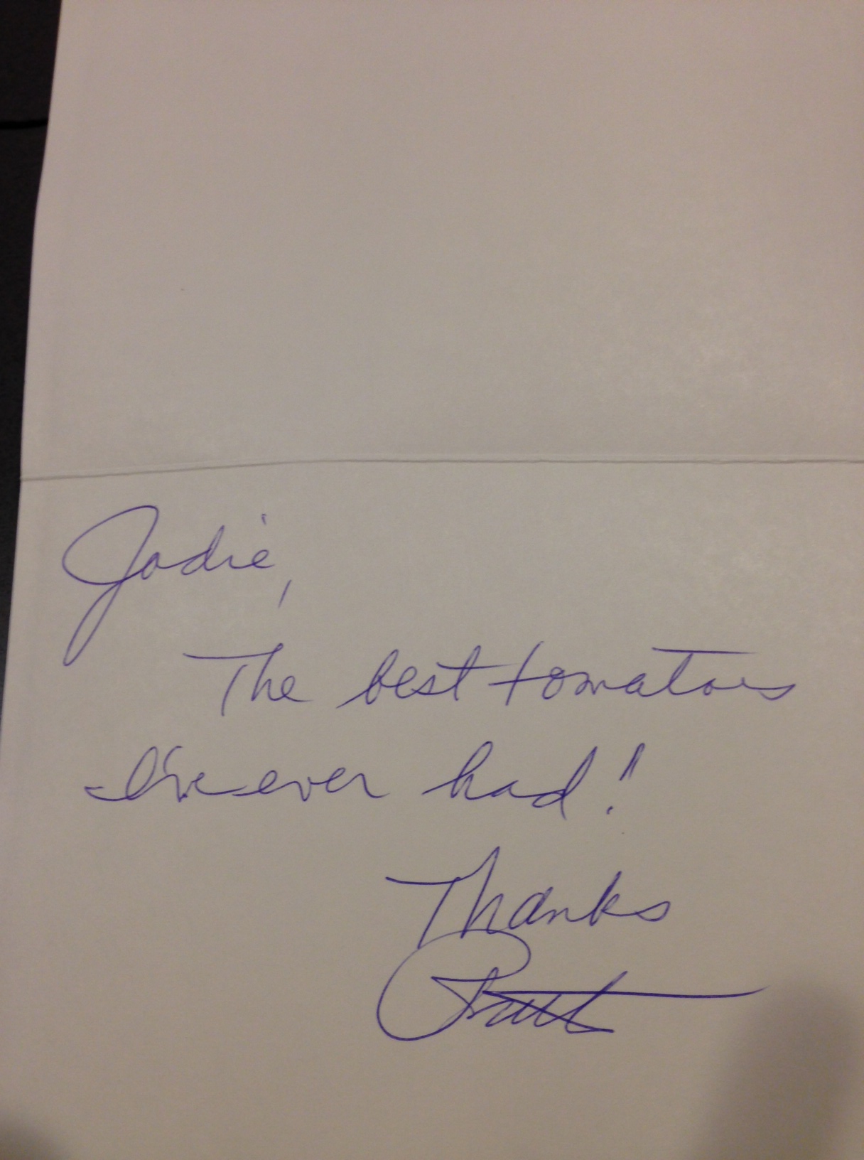 But this one is in the lead for best of show this season. Handwritten from an Ohio gal in her 70s. Whenever someone who spent their life in this place tells you your tomatoes are the best they ever had you can be only one thing: Humbled. (And you forgive them for adding an extra vowel to the end of your name.)