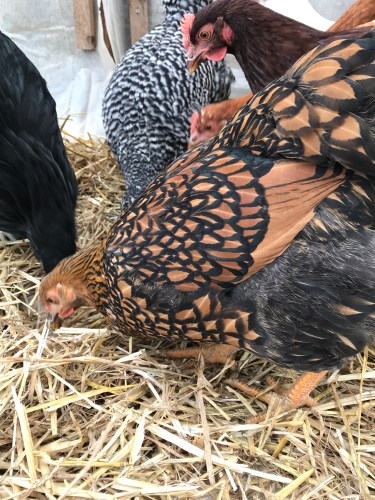 The Professor was reluctant to have her photo taken, she kept coming after the camera and pecking at me, so this is the best I can offer of her at this time. She’s the Golden Laced Wyandotte pecking at the ground.