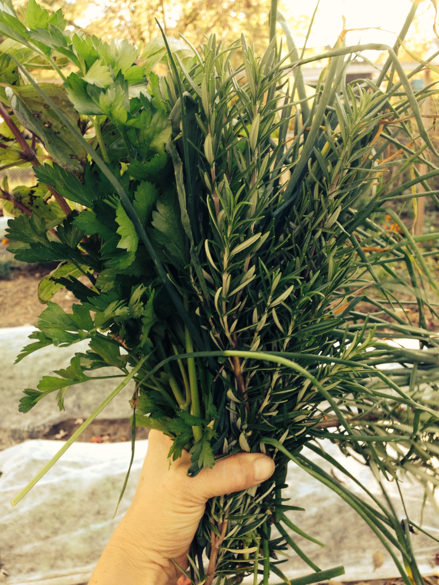 Todays’s harvest: arugula and mustard greens, rosemary, parsley, Thai basil, chives, and dahlias. Lots of things that go well with sweet potatoes and butternut squash. Bon appetitio!